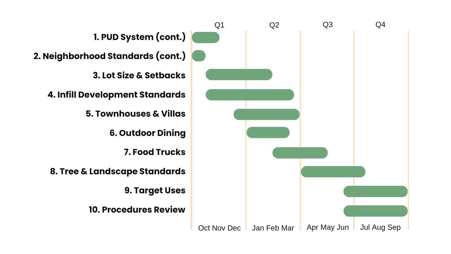 In September 2024, the Mayor and Board of Aldermen determined the implementation priorities for Fiscal Year 2025. Priorities include revisions to zoning district regulations, creation of new policies or guidelines, and updating online materials and resources. A schedule for completion of each task has been created to help coordinate staff resources. The exact timeline will be dependent on meeting schedules. As meetings and discussions are set, dates and additional information will be added to this page.